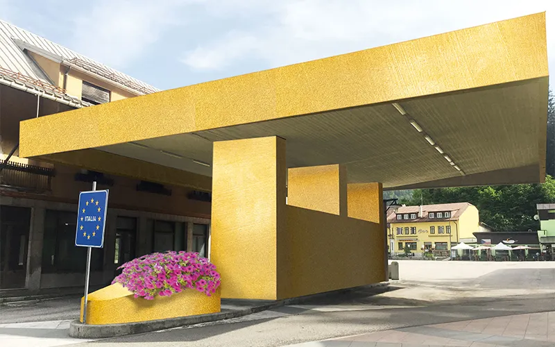Per anni, il confine di Stato tra Italia e Austria a Tarvisio è stato segnato da una dogana ormai in disuso, ridotta a un ricordo sbiadito di quella che un tempo era chiamata la "porta d’oro" tra due nazioni. Era necessario un intervento che riportasse in vita questo spazio, trasformandolo in un punto di interesse capace di attrarre visitatori restituendo valore al territorio e alla sua storia. Abbiamo collaborato a questa rinascita, reinterpretando l’ex dogana come un’installazione artistica. Il nostro obiettivo era dare un nuovo significato a questa struttura, rendendola un simbolo del legame storico tra Italia e Austria. L’edificio è stato interamente dipinto d’oro, richiamando il prestigio del passato e dando un tocco distintivo che cattura l’attenzione. Il colore oro, simbolo di bellezza, ricchezza e luce, avvolge ora la dogana, che si erge come un prezioso contenitore di storia e cultura. Con questo nuovo aspetto, la dogana di Tarvisio è tornata a essere un punto di incontro e un simbolo di dialogo tra due paesi.